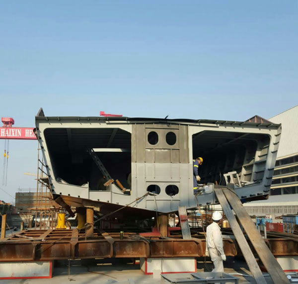 目前,先開(kāi)工的HX023船的鋁質(zhì)上建已經(jīng)制作完畢,等待吊裝,后開(kāi)工的HX022船的機(jī)電設(shè)備已逐步到廠。兩艘公務(wù)船的美麗線型,已在總裝平臺(tái)上展現(xiàn)雛形。