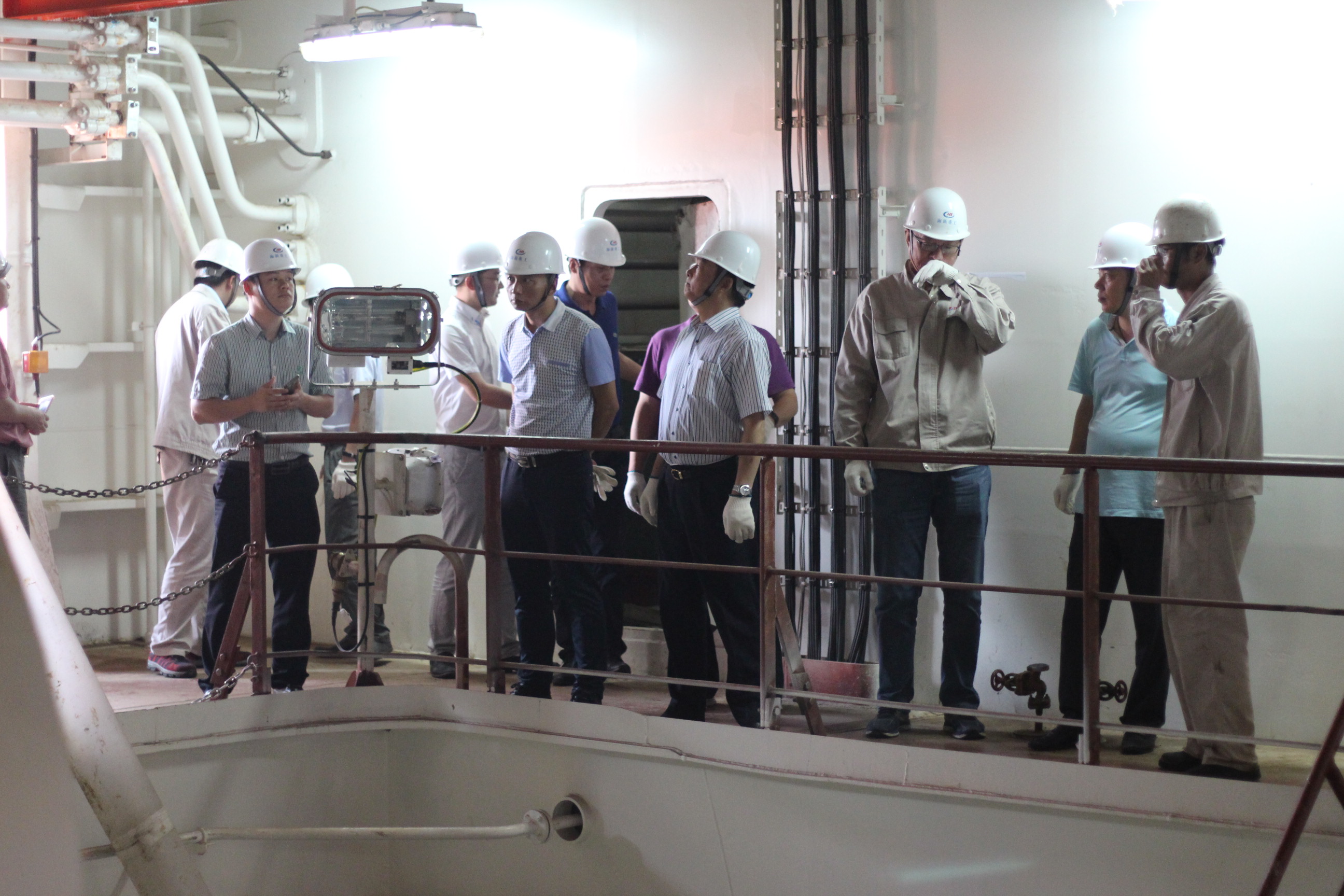 會(huì)后在公司執(zhí)行董事武亦文先生的帶領(lǐng)下,專(zhuān)家們前后參觀了兩艘調(diào)試中的6500m³/h絞吸式挖泥船,搭載中的兩艘8000m³耙吸式挖泥船,以及分段建造中的3000m³對(duì)開(kāi)體式泥駁船、5000噸油駁船。下午專(zhuān)家們更是頂著烈陽(yáng),乘坐交通艇到錨地參觀了剛剛成功試航的7000m³耙吸式挖泥船。從機(jī)艙到泵艙,從艉部到艏部,從主甲板逐層參觀直到駕駛室,專(zhuān)家們都進(jìn)行了仔細(xì)的考察。