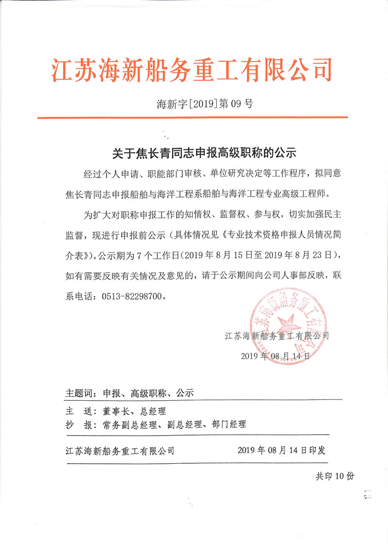 您好,歡迎訪問【申報公示】關于高級職稱的公示-公司新聞-江蘇海新船務重工有限公司-江蘇海新船務重工有限公司網站!
